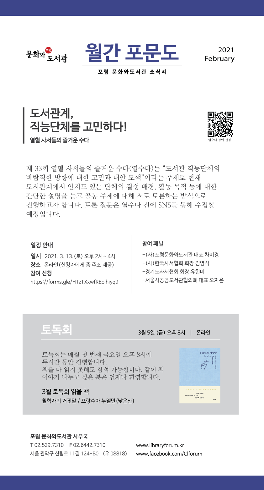 포럼소개/월간 포문도 월간 포문도 2월호 by 포럼문화와도서관 2021. 3. 2. 공유하기 게시글 관리 포럼 문화와도서관 '포럼소개 > 월간 포문도' 카테고리의 다른 글 월간 포문도 2021년 3월호 (0) 2021.03.31 월간 포문도 1월호 (0) 2021.03.02 관련글 월간 포문도 2021년 3월호 월간 포문도 1월호