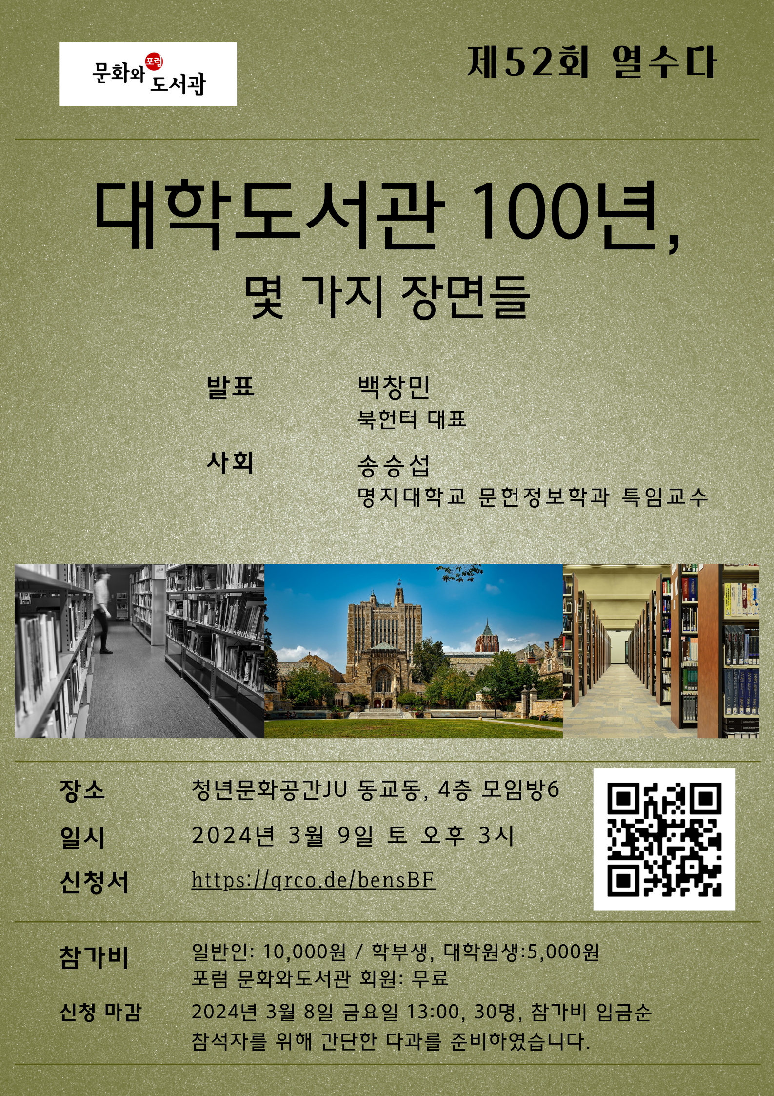 52번째 포문도 열수다는 <대학도서관 100년, 몇 가지 장면들>이라는 주제로 백창민 대표 님이 발표합니다.