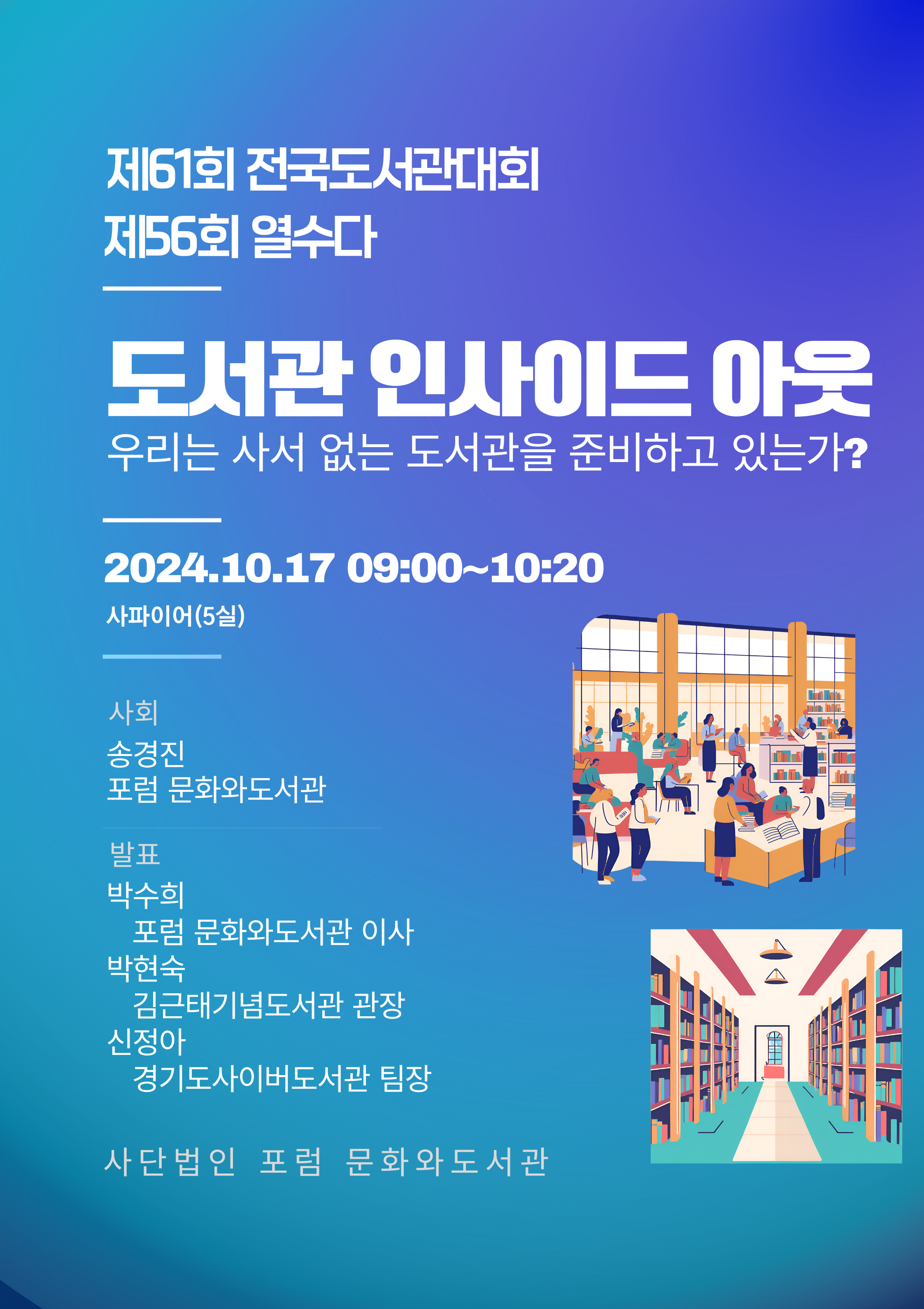 사단법인 포럼 문화와도서관의 제56회 열수다는 <도서관 인사이드 아웃: 우리는 사서 없는 도서관을 준비하고 있는가?>라는 주제로 제61회 전국도서관대회에서 진행합니다.