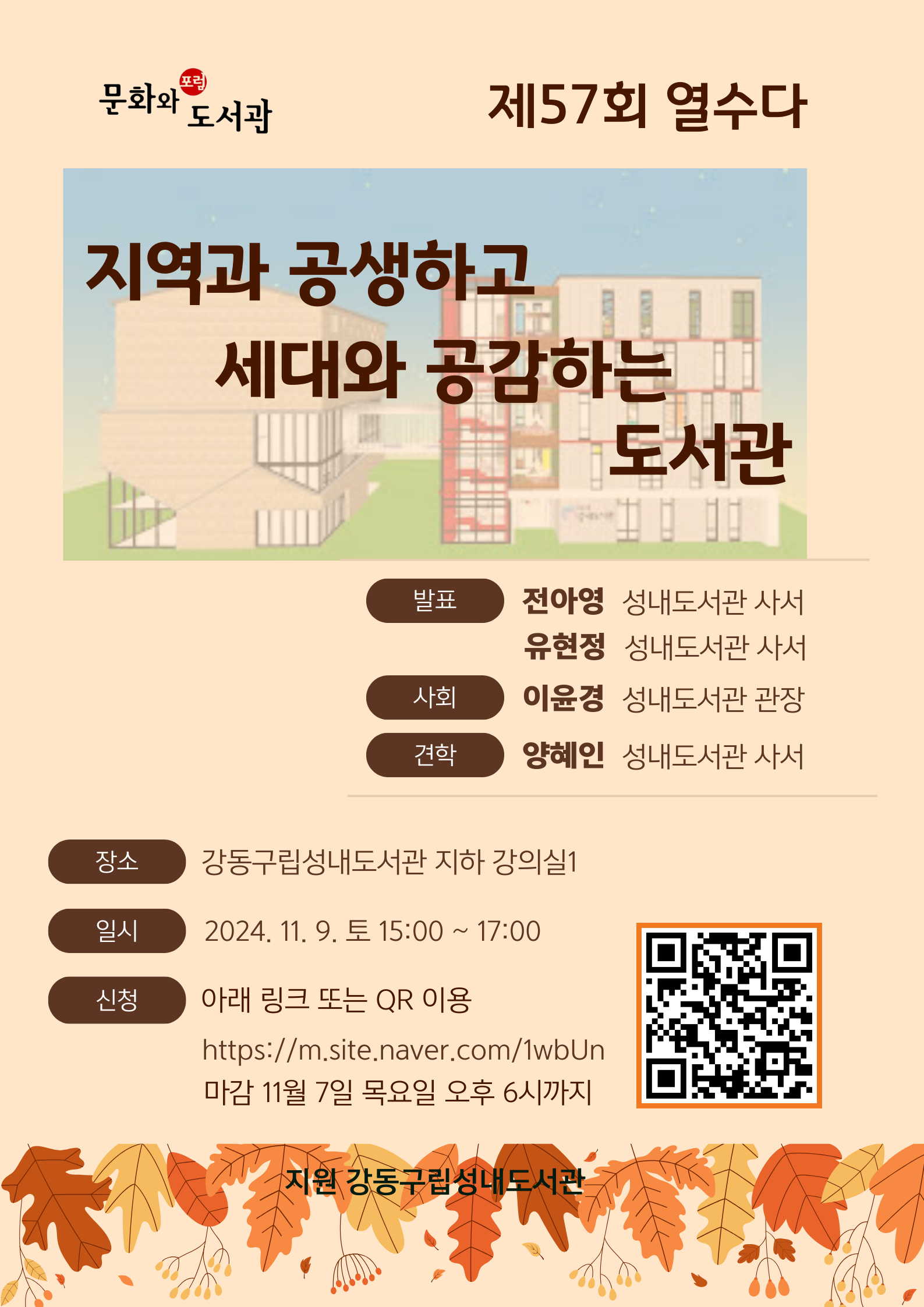 57번째 포문도 열수다는 <지역과 공생하고 세대와 공감하는 도서관>이라는 주제로 강동구립성내도서관의 후원으로 진행합니다.