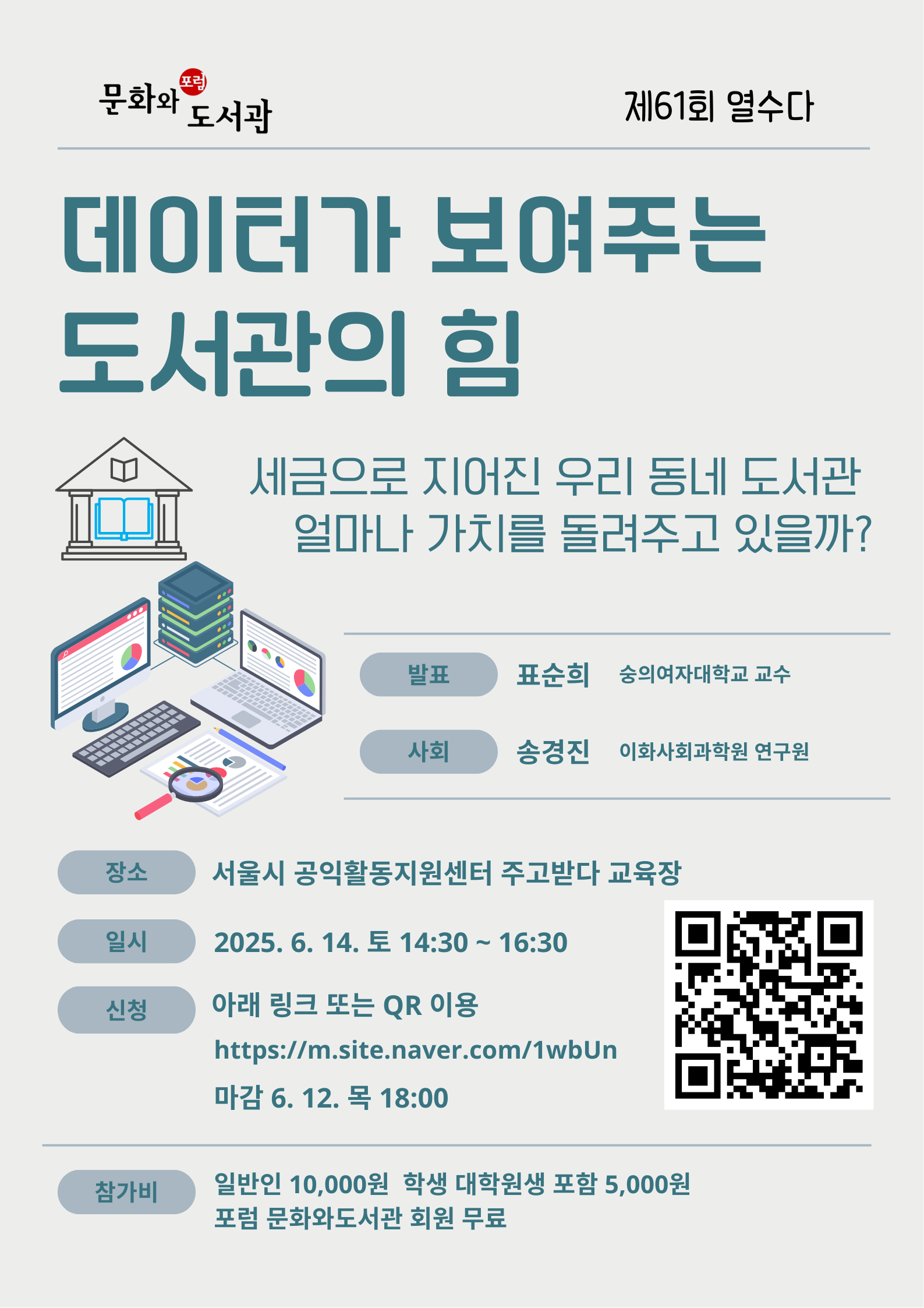 61번째 포문도 열수다는 <데이터가 보여주는 도서관의 힘: 세금으로 지어진 우리 동네 도서관, 얼마나 가치를 돌려주고 있을까?>라는 주제로 진행합니다.