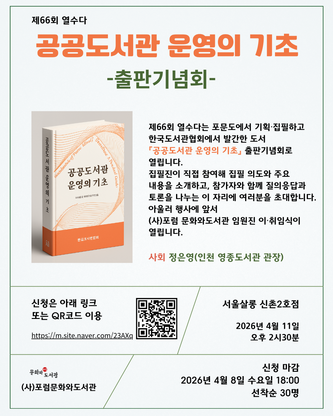 아울러 행사에 앞서 (사)포럼문화와도서관 임원진 이·취임식이 열립니다.